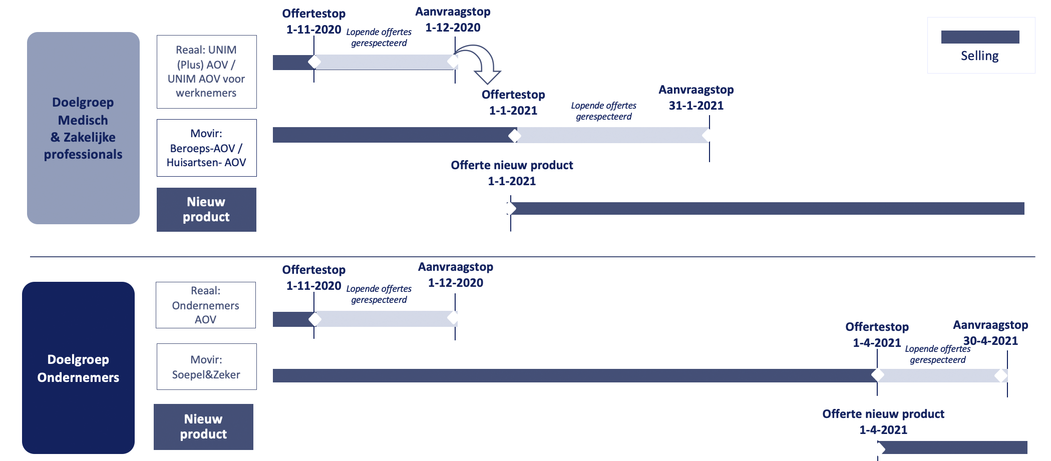 Met de introductie van de nieuwe propositie, maken we onze huidige producten ‘non-selling’. Dat betekent dat hier offerte en aanvraagstops voor komen. In het onderstaande schema lees je wanneer wat gepland staat. Deze planning is nog onder voorbehoud.