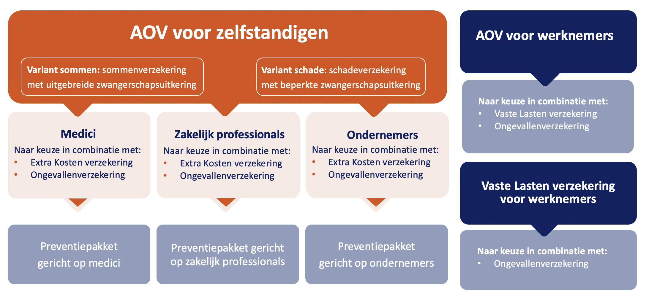 We komen met een nieuwe propositie waarbij producten en diensten een geheel vormen. Voor zelfstandigen ontwikkelen we een schade- en een sommenvariant die je naar keuze kan combineren met een extra kosten en/of een ongevallenverzekering. Ook komt er een aov voor werknemers, die je eventueel kan uitbreiden met ongevallenverzekering en/of een vaste lastenverzekering. De preventiediensten worden op maat ontwikkeld voor de verschillende doelgroepen en worden in samenwerking met hoogwaardige providers ontwikkeld en uitgevoerd.