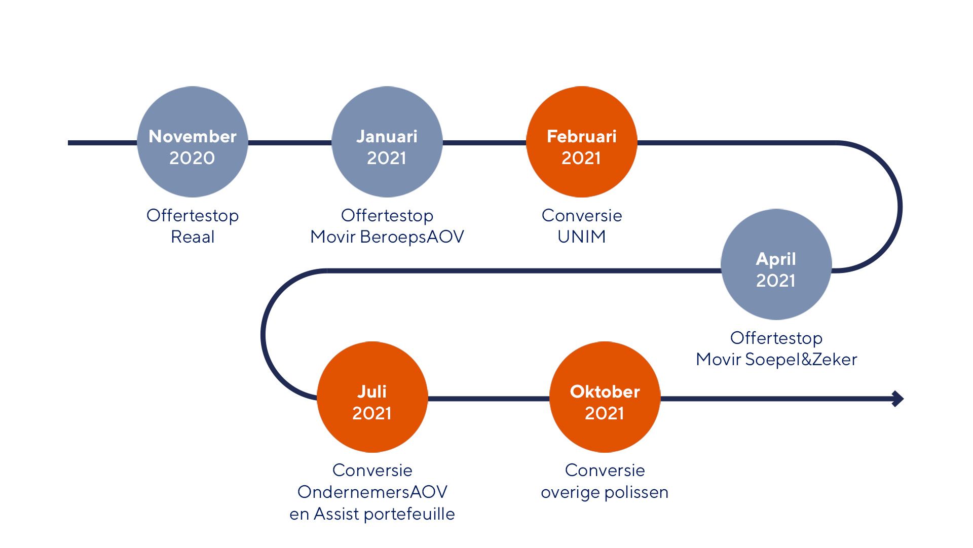 Een maand voordat de Reaal-AOV naar ons administratiesysteem verhuist, ontvang je als adviseur bericht van Movir. De verzekeringnemer ontvangt een aankondiging van Reaal. Zodra de aov is verhuisd, ontvang je een kopie van de polis en de brief die Movir naar je relatie stuurt. Vervolgens ontvangen verzekeringnemers en arbeidsongeschikte verzekerden bericht van Movir. De eerste polissen - UNIM-polissen - gaan in februari 2021 over. Dus heb je zo´n polis in je portefeuille, dan ontvang je begin januari 2021 bericht van Movir.